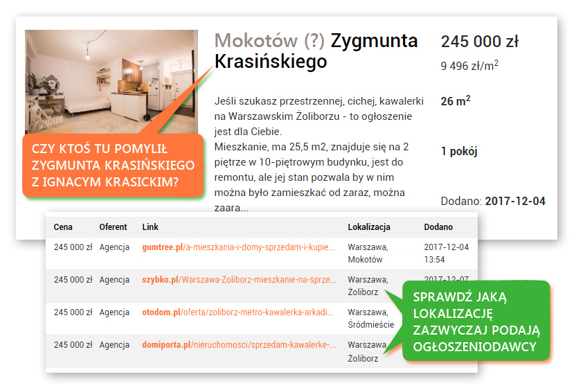 Zobacz jaką lokalizację zazwyczaj podają ogłoszeniodawcy i wyrób sobie własną opinię odnośnie tego gdzie naprawdę jest to mieszkanie.W przykładzie poniżej i tak nie jest to łatwe, prawda? :D